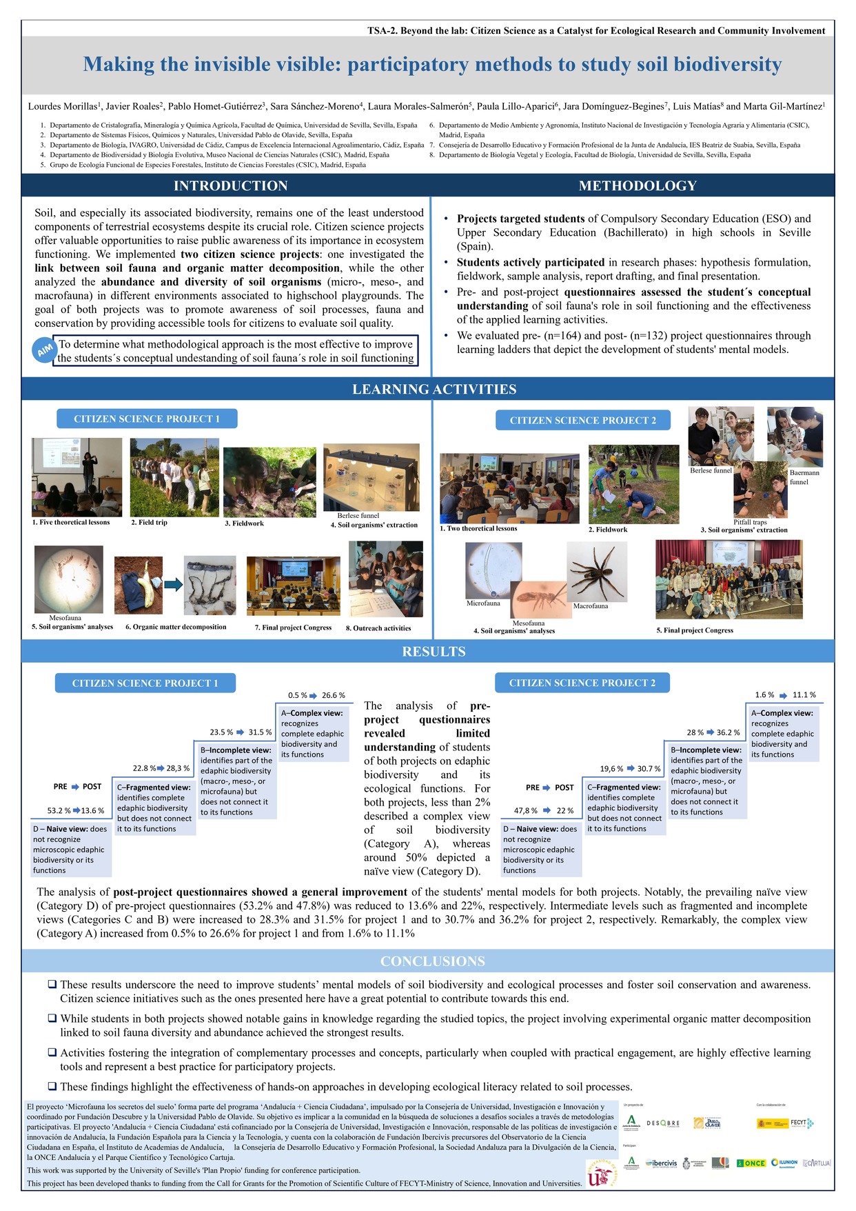 Ambos proyectos se implementaron en institutos de España en 2024. Las metodologías utilizadas incluyeron protocolos sencillos, materiales de fácil acceso y herramientas de aprendizaje adaptadas a la edad de los participantes. Los estudiantes participaron activamente en la mayoría de las etapas de la investigación: la formulación de hipótesis, el trabajo de campo, el análisis de muestras, la redacción del informe final y la presentación de sus resultados en las reuniones finales del proyecto. Se sometió a los estudiantes a cuestionarios previos y posteriores al proyecto para evaluar su comprensión conceptual del papel de la fauna del suelo en el funcionamiento edáfico, así como el éxito de las metodologías aplicadas en cada proyecto.